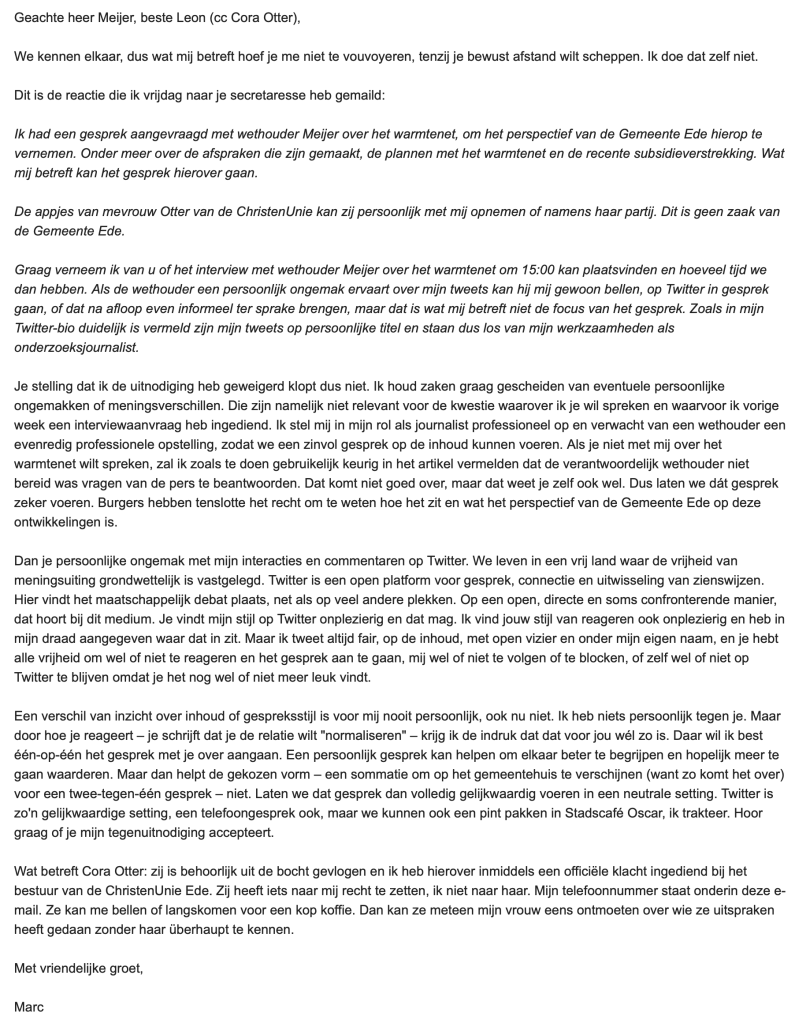 Ik antwoordde dat Otter me gewoon kon bellen als ze iets recht wilde zetten. Omdat ik de week ervoor toevallig ook een interview met Meijer had aangevraagd over het Edese warmtenet, liet ik zijn secretaresse weten dat ik het gesprek daarover graag met hem wilde voeren. Dat schoot blijkbaar in het verkeerde keelgat, want van Meijer ontving ik op zaterdagavond tegen elf uur een tweede dringende ‘uitnodiging’ om op het gemeentehuis te komen praten over mijn tweets. Ik gaf vriendelijk aan dat ik best een gesprek met hem wilde voeren, maar graag wel gelijkwaardig en in de juiste context, dus niet als een ‘sommatie’ op het gemeentehuis.