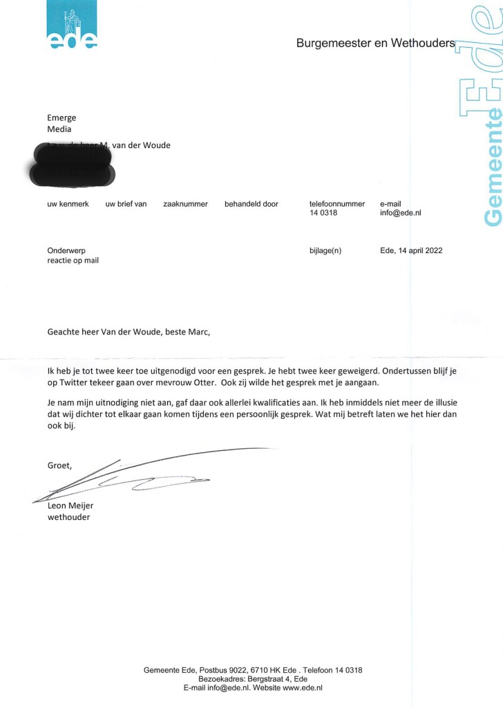 Toen ik wethouder Meijer herinnerde aan mijn tegenuitnodiging, stuurde hij me op Goede Vrijdag deze brief, namens het College van B&W, op briefpapier van de Gemeente Ede: