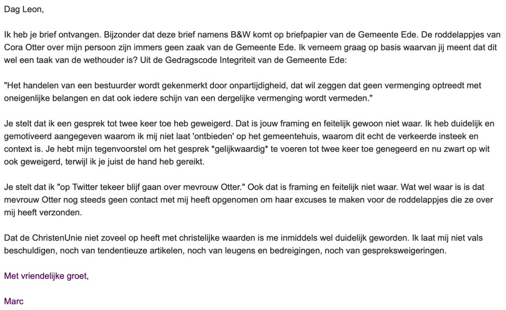 Van Meijer ontving ik geen enkele reactie op mijn tegenvoorstel. Ook belde Otter mij niet op. Na negen dagen ontving ik wel een reactie van het bestuur van de ChristenUnie Ede, bij monde van voorzitter Simcha Looijen.