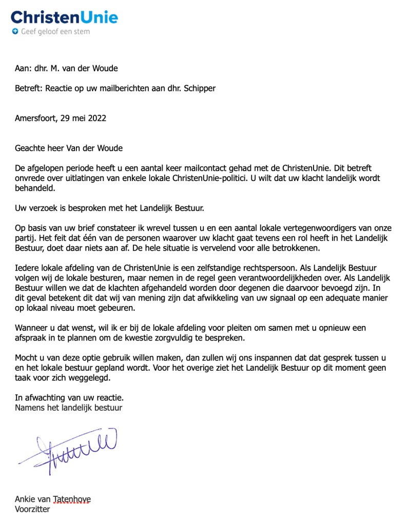 NASCHRIFT: Op 30 mei ontving ik nog een brief van de voorzitter van het landelijk bestuur van de ChristenUnie, Ankie van Tatenhove. Hier heb ik kort op gereageerd. Voor de volledigheid en transparantie voeg ik deze bij.