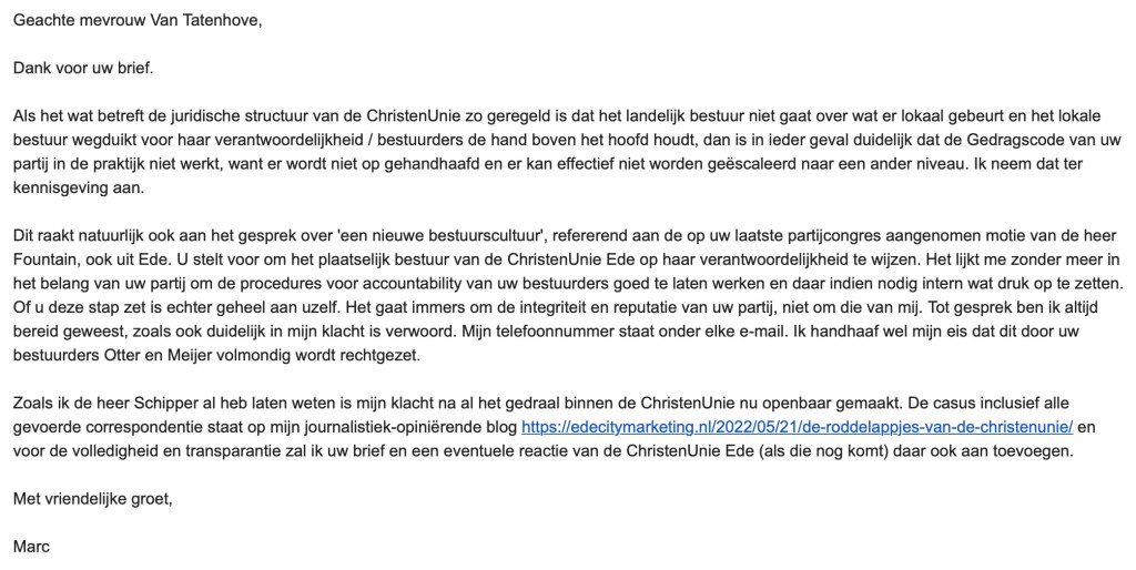 Daarom heb ik op 26 maart een officiële klacht ingediend bij het bestuur van de ChristenUnie Ede.